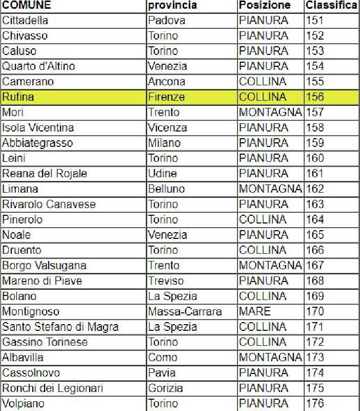 Il nostro comune è al 150° posto (tabella 5 sottostante) in una classifica, guidata dalla città di Brunico in Trentino, che comprende 176 cittadine scelte tra più di 8.000 in Italia. In tutta la Toscana soltanto 11 comuni hanno ottenuto il titolo e nella provincia di Firenze solo 6.